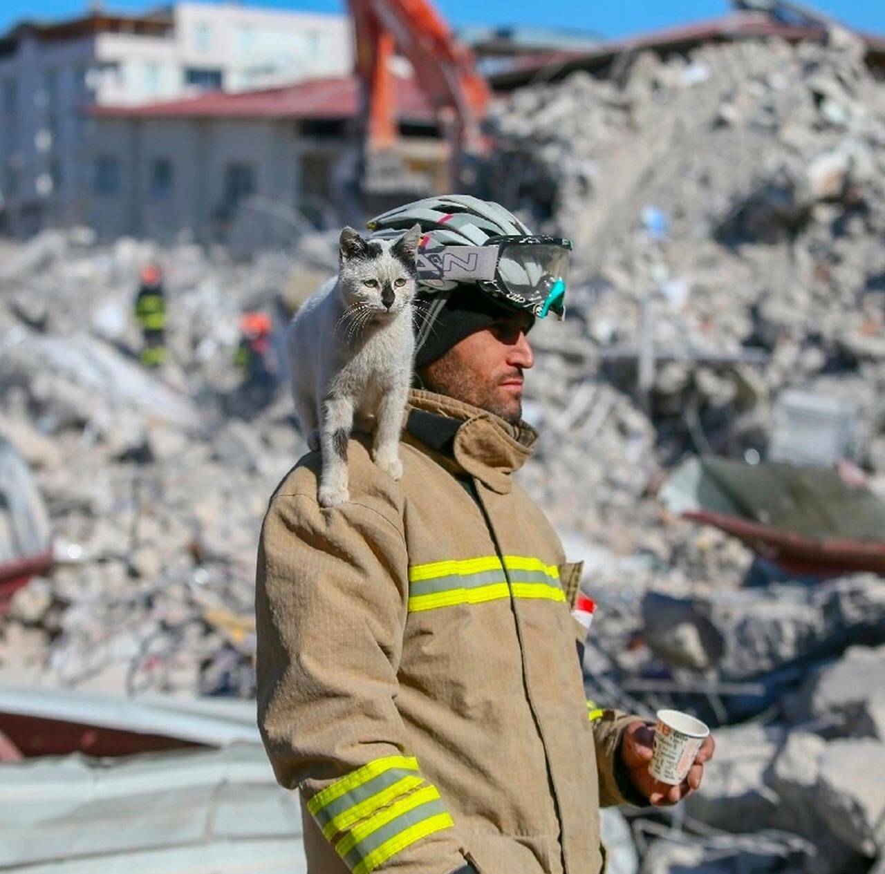 Кот, которого достали из-под завалов в Турции, уже несколько дней не отходит от своего спасителя.
