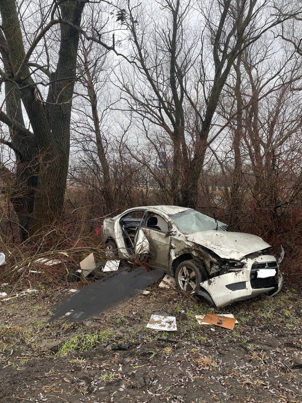На автодороге Армавир - Курганинск мужчина на «Мицсубиси Лансер» врезался в дорожные знаки и дерево.